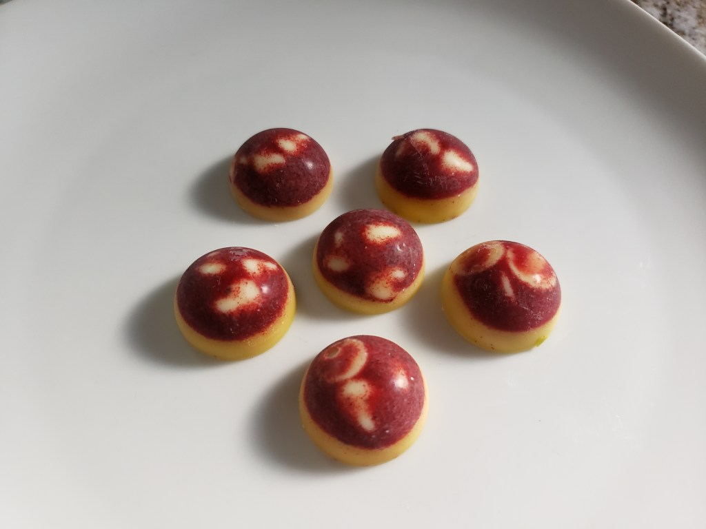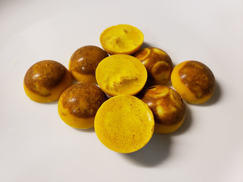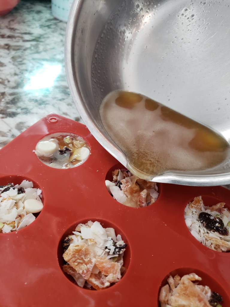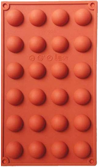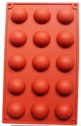 I purchased a three-mold set on Amazon. Using a 15-hole silicone mold, you can get 1-1/2″ domes that hold a tablespoon of yummy goodness. With the 24-hold mold, you get one-inch domes that hold a teaspoon of sweetness. Since cacao butter is not sweet, you add the desired level of sweetness, but be careful that you consider the natural sugars in things you add.