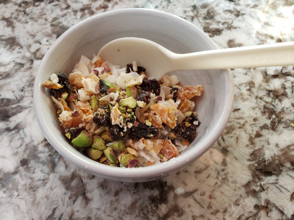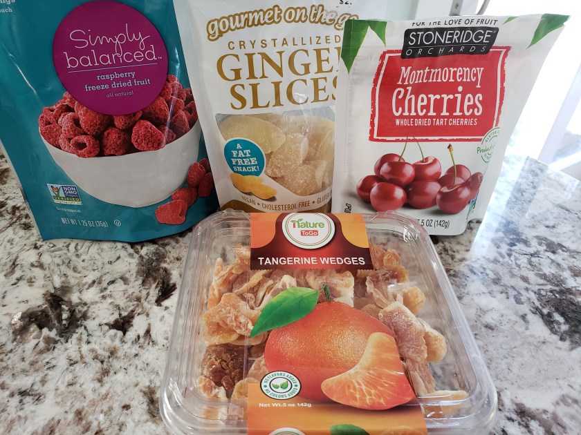 Then you’ll want to give it some more flavors with dried fruits such as dates, cherries, oranges (Big Lots has some wonderful dried tangerine segments!), cranberries, strawberries, or blueberries. You can add spices such as cinnamon, cardamon, or turmeric, or you can use extracts such as almond, vanilla (extract, powder, or paste), peppermint, or any other of your faves. For the uber-health-conscious, you can add your MCT oil, Golden Milk mixture, or mushroom powders, too. I’ve tried these with cocoa powder, but I felt it overtakes the other flavors. If you need to have some chocolate (I prefer cacao nibs), add some white or dark morsels sparingly. Basically, add whatever is in your palette of fun flavors.
