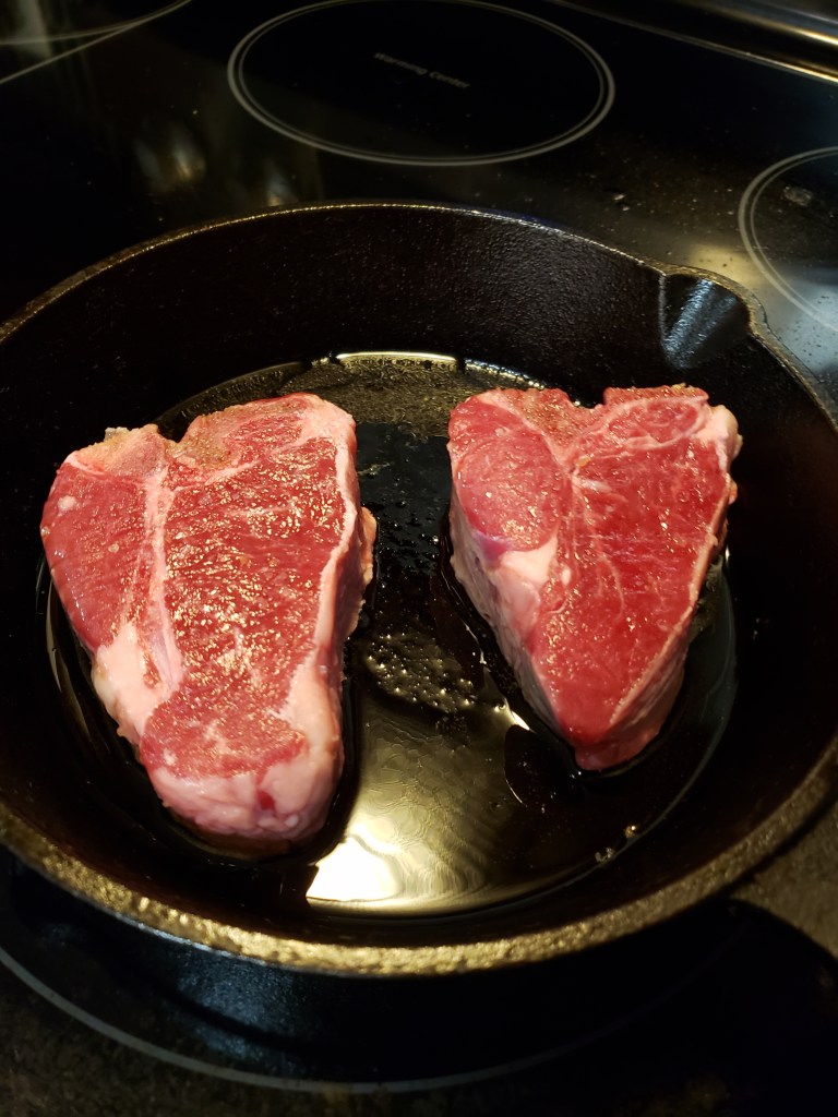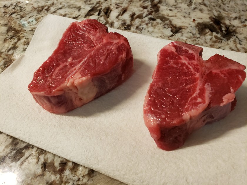 I stumbled upon some beautiful lamb chops at Food Lion one day, and the price was incredible. I wasn’t sure how to cook them because I hadn’t cooked lamb chops before, only a crown roast. This chop is the lamb loin chop – the T-bone type – rather than a chop from a lamb rack. The home delivery service Home Chef has had some beautiful chops on their menus that were twice this thick, so cooking time will vary on thickness.