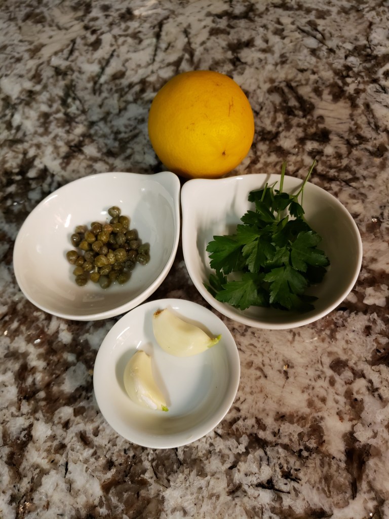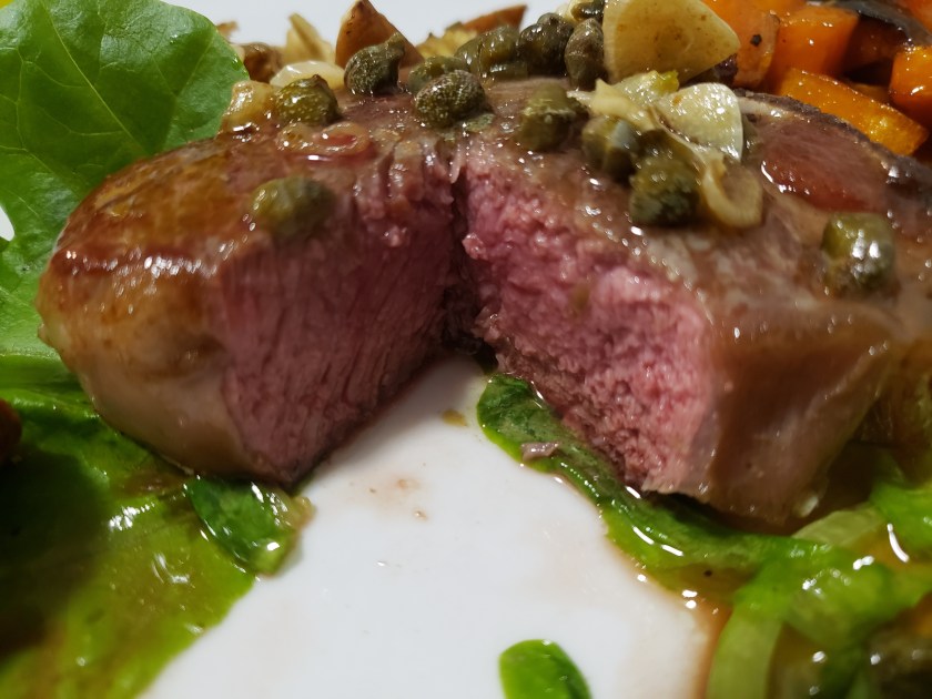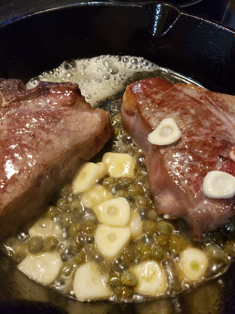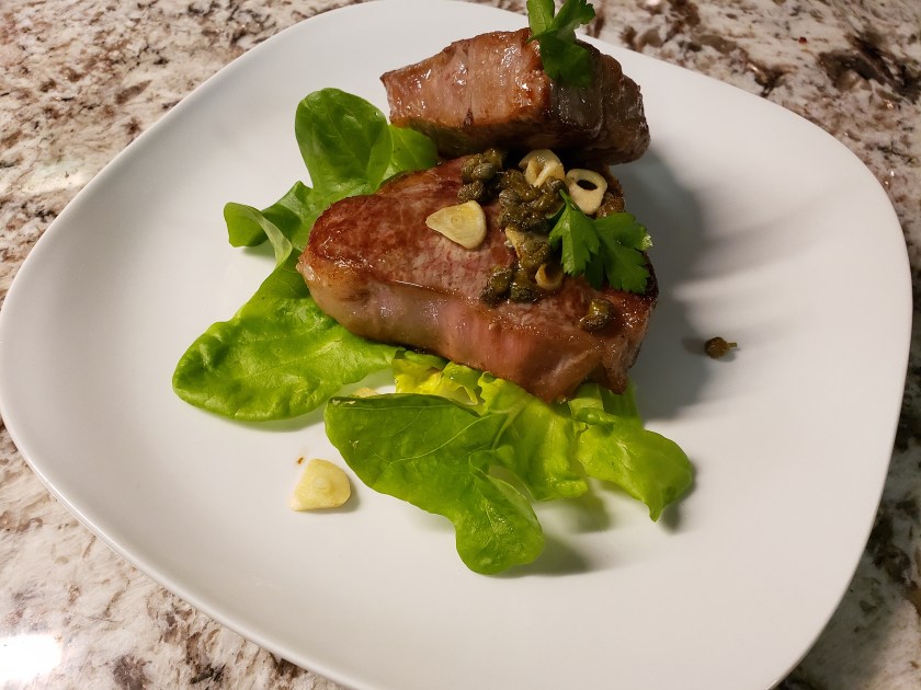 When all sides are seared, add a tablespoon of real butter. Before popping them in the oven, I add garlic, parsley, and capers to the pan. Cooking time for chops is about 4 to 6 minutes for medium (pink inside). That’s my favorite temperature for lamb chops. When the chops come out, I add some fresh chopped parsley and then squeeze some Meyer lemon from my own tree (I grow these indoors so I have lemons year-round) over the top and serve with the pan drippings.