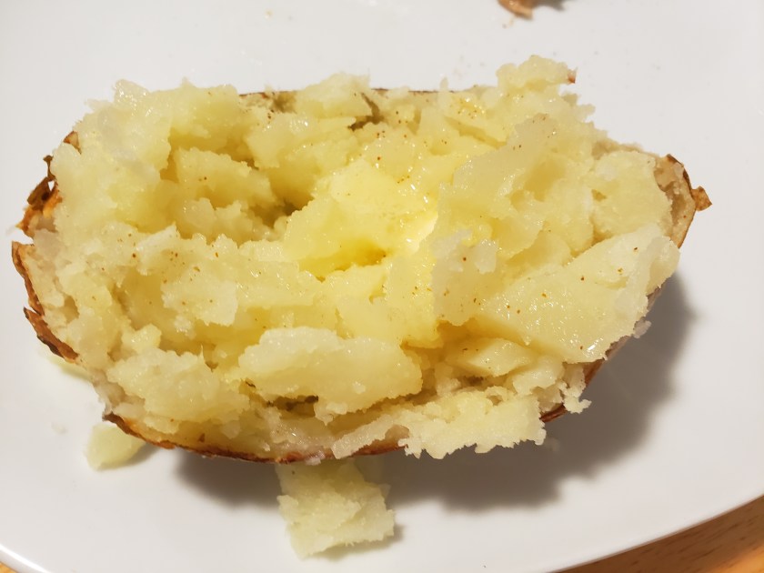 Crusty skin with salt and a fluffy interior. That is how you cook a baked potato. My dad has purchased those cellophane-wrapped baked potatoes from Piggly Wiggly, and the first thing I do is cut off the plastic. He would put his in the microwave (don’t even think about the microwave – yuck!) while I would put mine in the oven at some random temperature for some unknown time – until I thought it was done. Of course, he’d have to wait until mine was done before dinner.