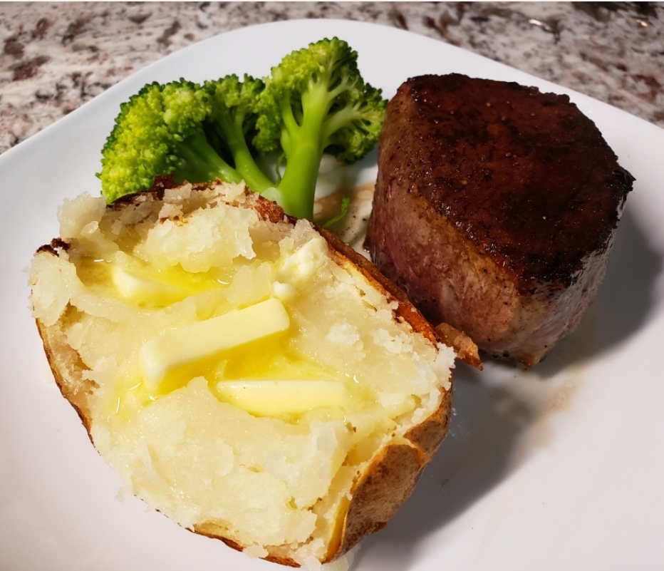 Cook for 45 to 60 minutes for a 7-ounce to 9-ounce potato. “Senior-sized” smaller potatoes would be done in about 35 to 40 minutes. Take out of the oven and brush each potato on all sides with olive oil. Bake for an additional 10 minutes. If you’re cooking the steak above, you can pop in the steak about 5 minutes after you’ve put the potatoes back in the oven.