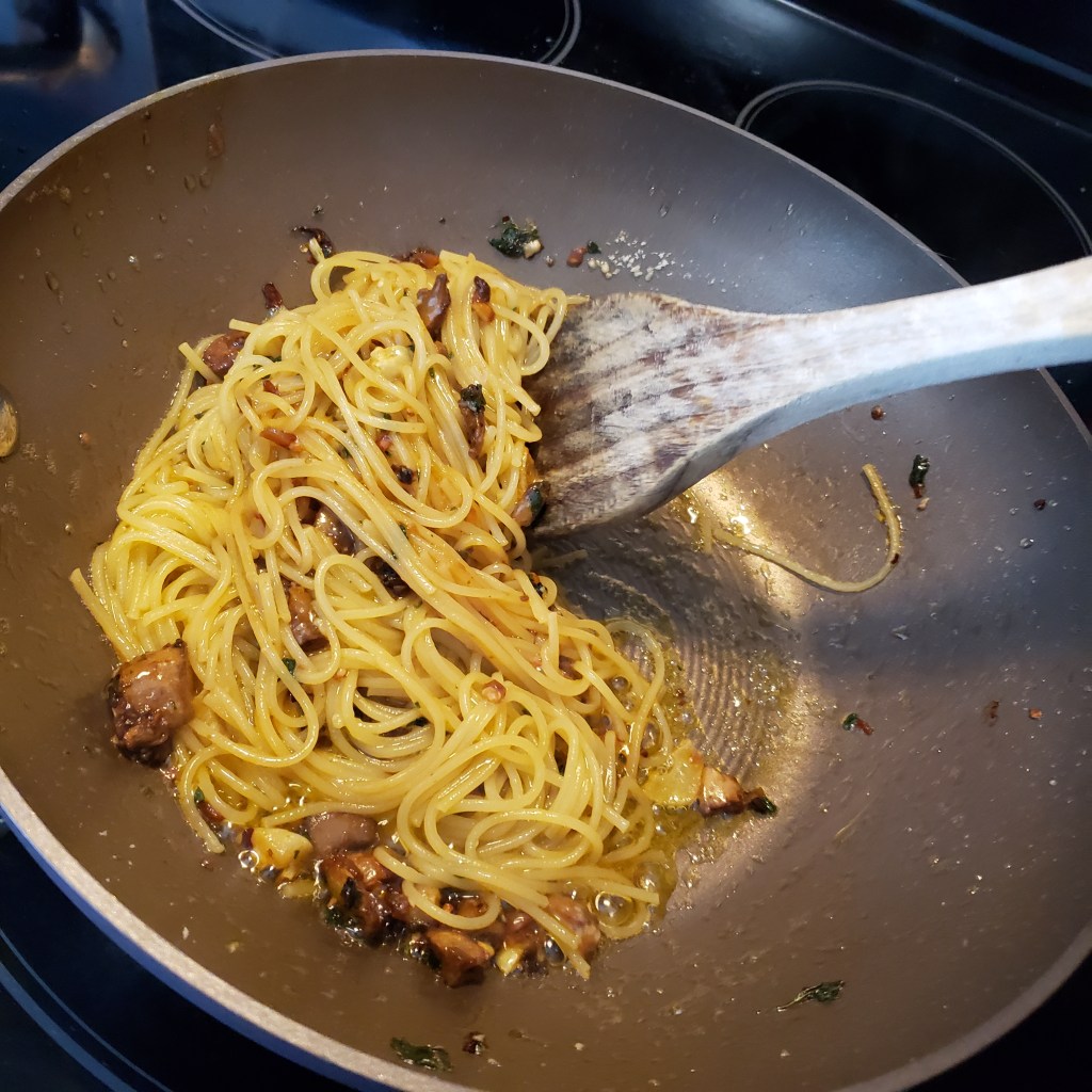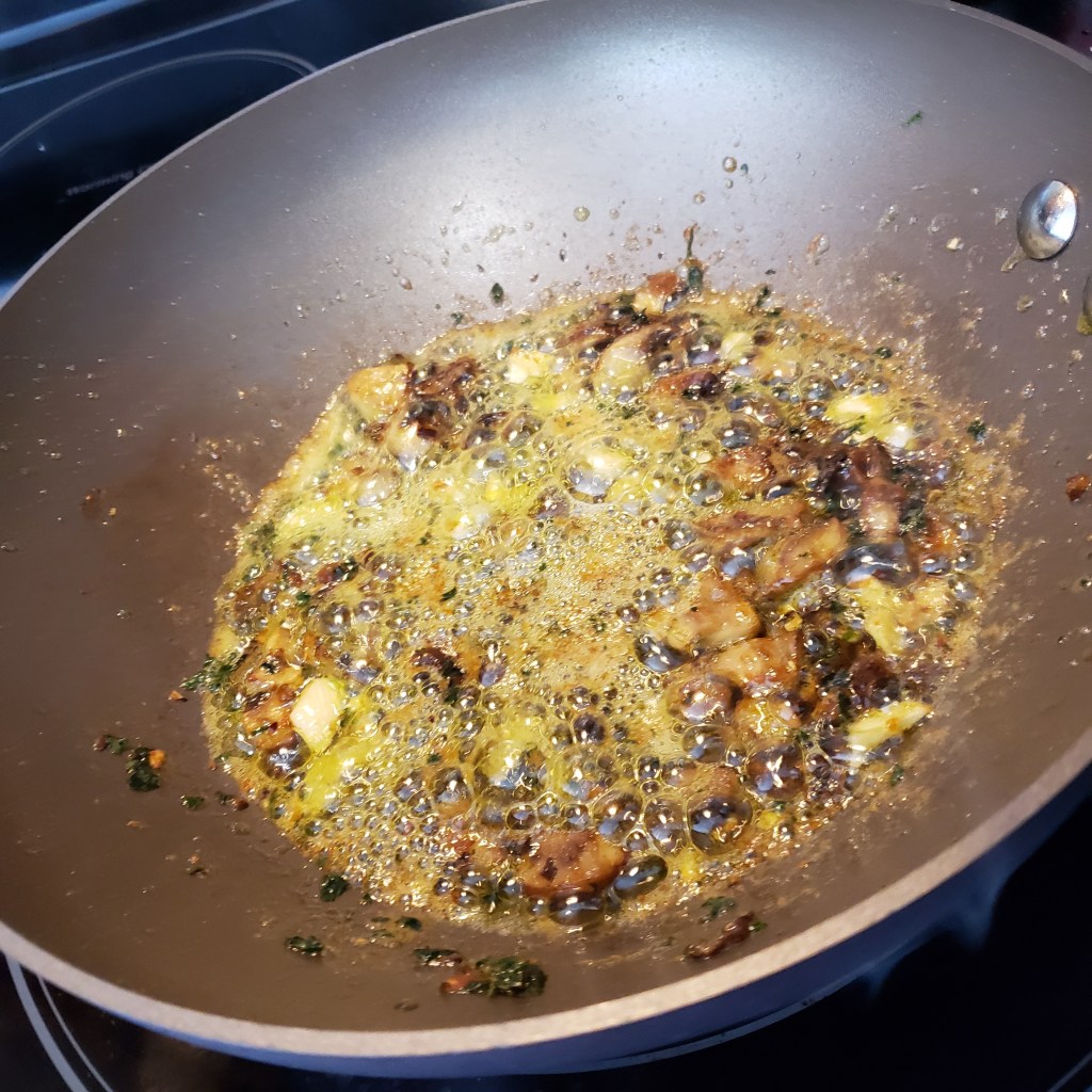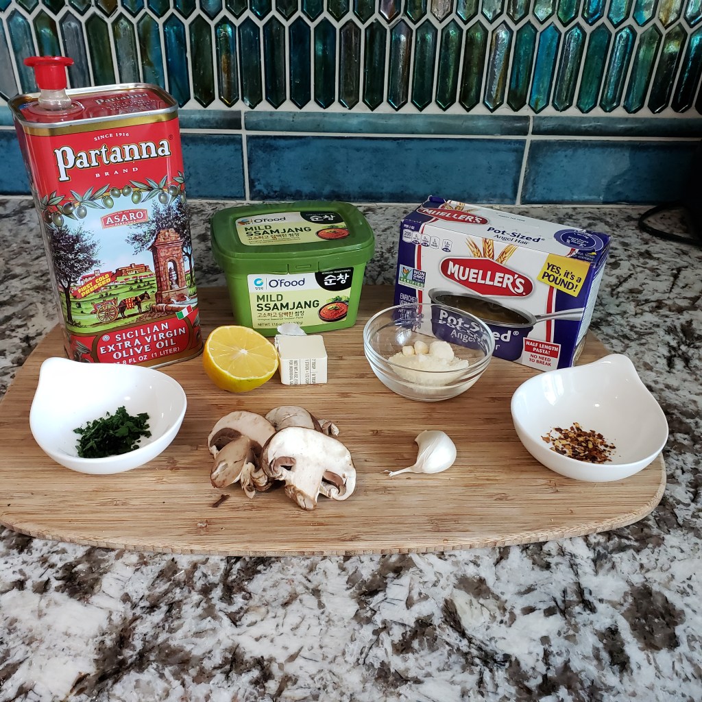 Cook until the edges of the mushrooms are golden. Lower heat to medium. Add butter, garlic, red pepper flakes, ssamjang, oyster sauce, and parsley flakes. Let the mixture come to a bubble, then simmer on low heat while pasta finishes cooking.