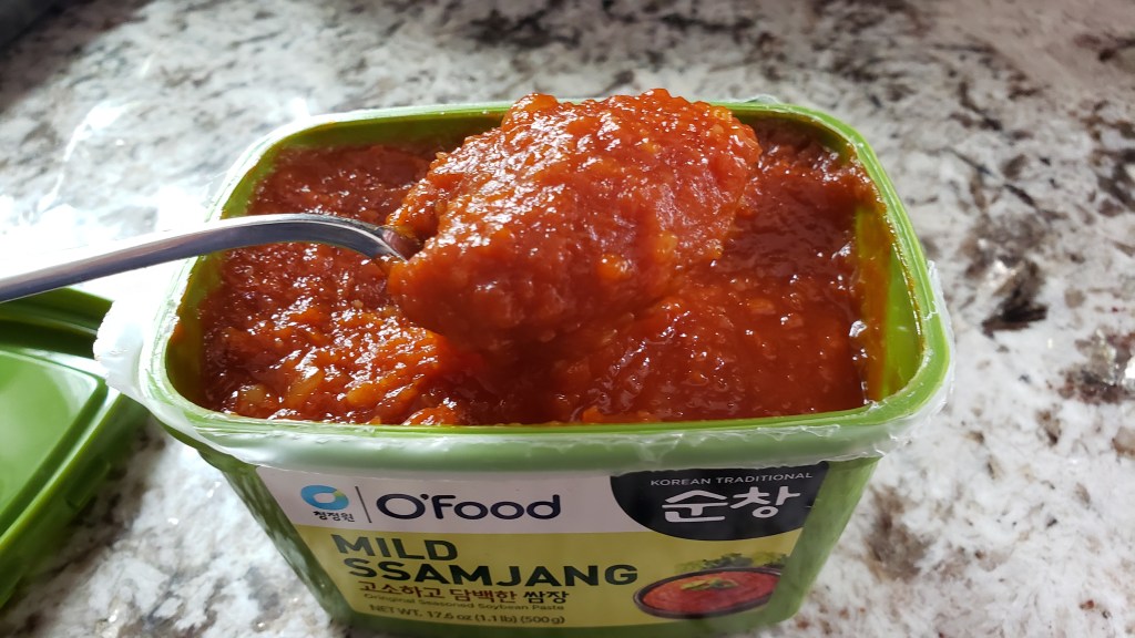 Korean language lesson: ssam means wrap, and jang means paste (“wrap paste”); thus deonjang (된장) means soybean paste and gochujang (고추장) means red pepper paste. If you’re interested in learning more about these Korean condiments, watch this video from the always-entertaining Korean foodie Maangchi on YouTube.