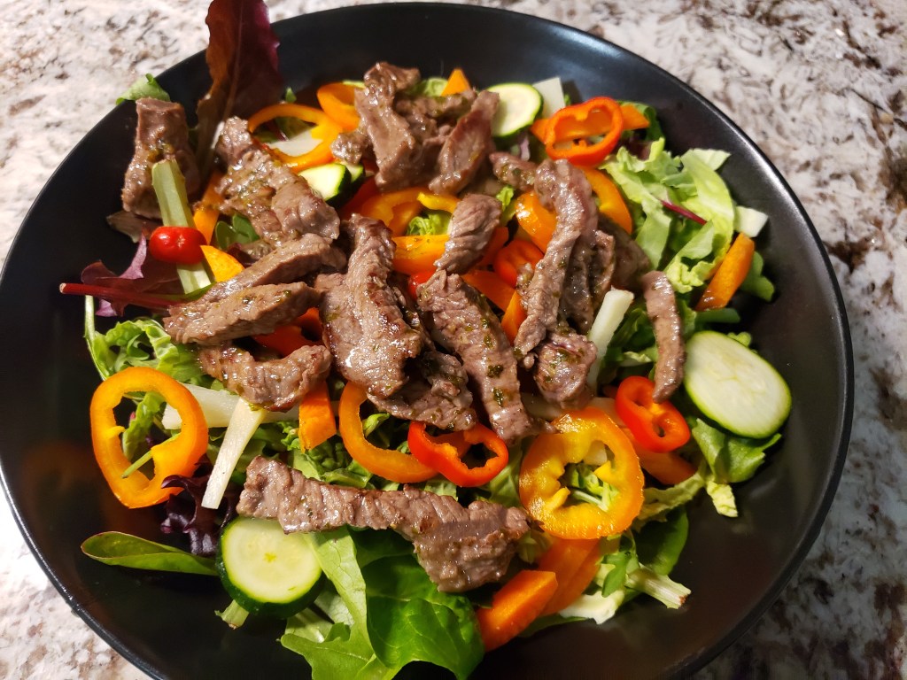 On the stove top, stir-fry the sirloin steak in olive oil over medium-high heat. It should take about 3 minutes to cook all sides.