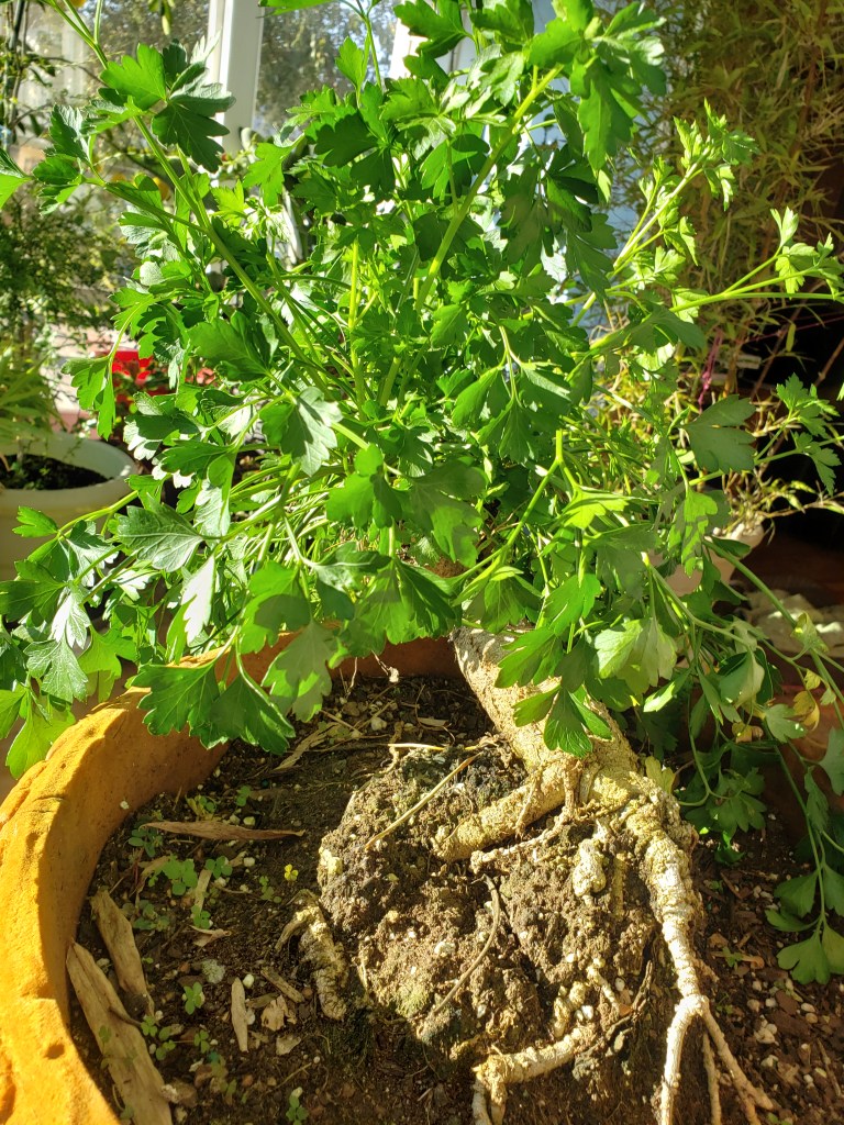 One of my delights is my “old parsley tree” that I bought from a local home improvement store. I used to leave the parsley plants outside during the winter and just buy new ones the following year since they were so cheap. One year, I brought it indoors to see how long I could keep it. That was over 8 years ago! Admittedly, the younger parsleys have leaves that are more tender, so I often buy more parsley during the year. But watching this old gal thrive and get a hard trunk has been neat. By the way, Google says parsley lives only 2 years. Ha!