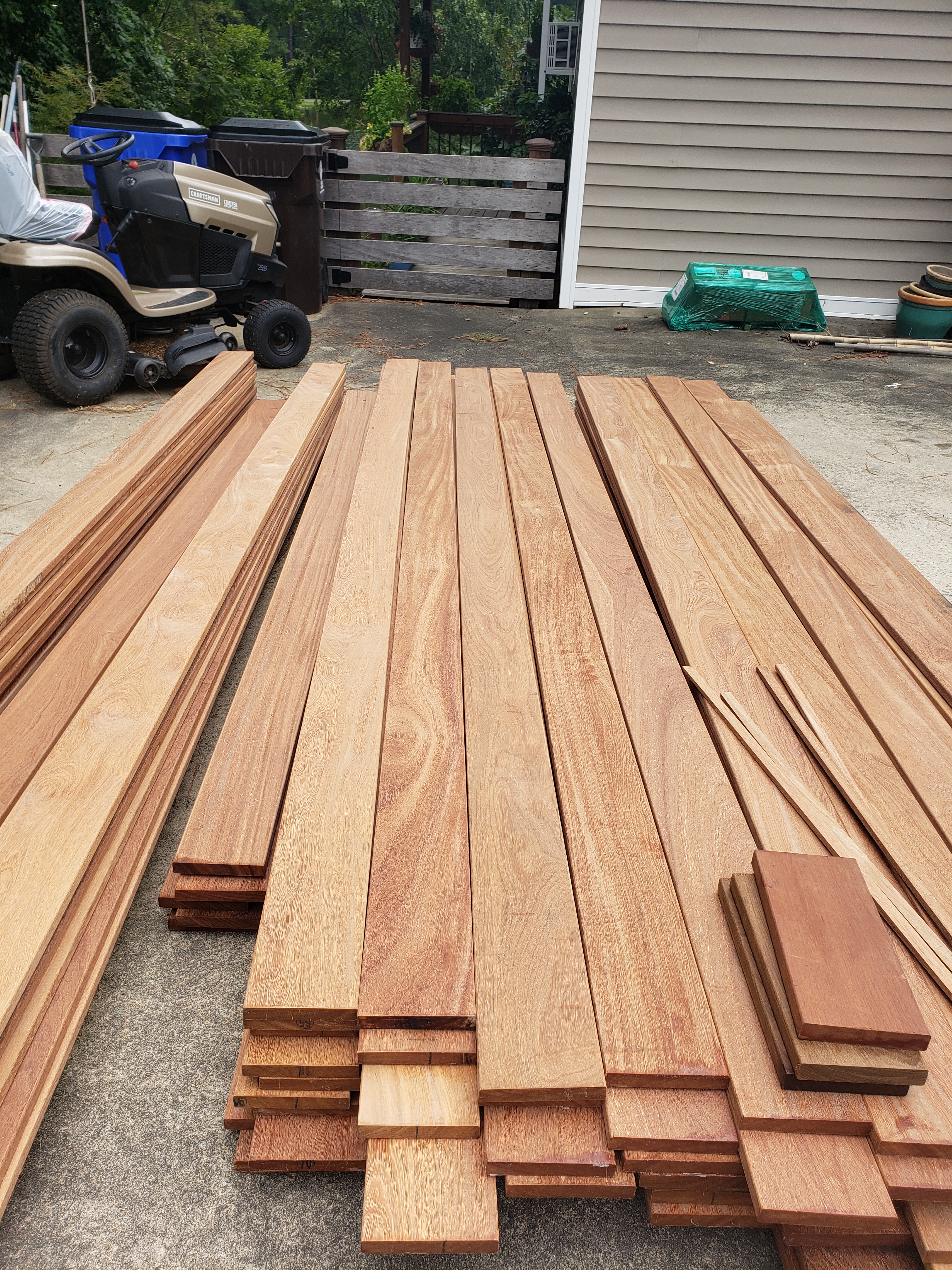 Over 3,200 pounds of Cumaru were delivered for the decking. Supplies were limited for matching rails and posts, so I needed an alternative. While the hardwood is pricier than treated decking, it holds up extremely well to the season AND to carpenter bees. My other decks are Tigerwood, but it was not in stock, so I went with a complementing, delightful Plan B. The grain on this wood is gorgeous!