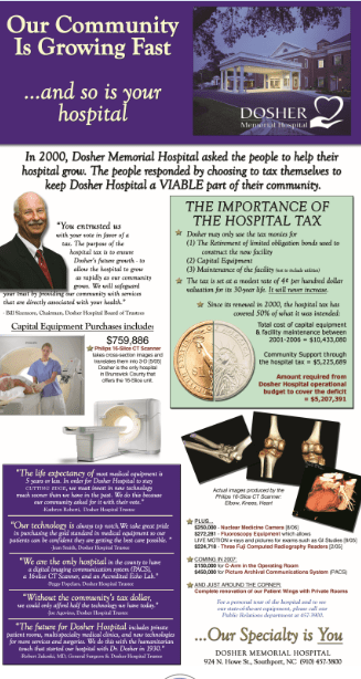 Dosher Hospital is one of a few hospitals that is supported by a tax that was voted on by the community. The tax was due to expire, and the hospital had to communicate why the tax should be continued. The community voted to continue taxing themselves to keep Dosher financially sound.