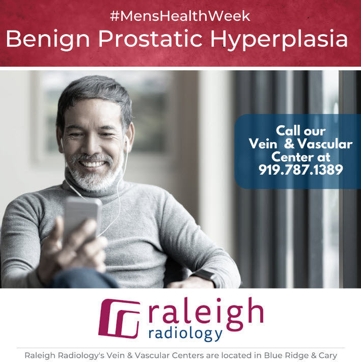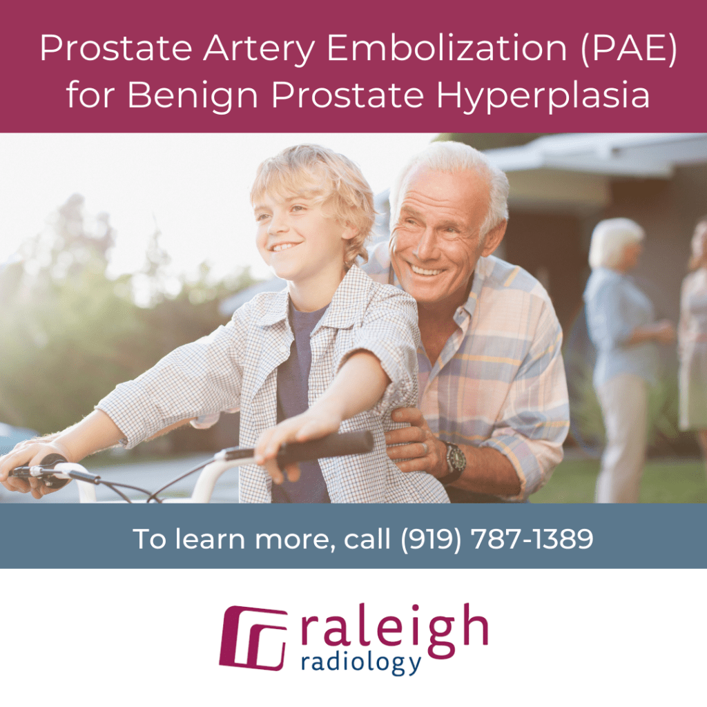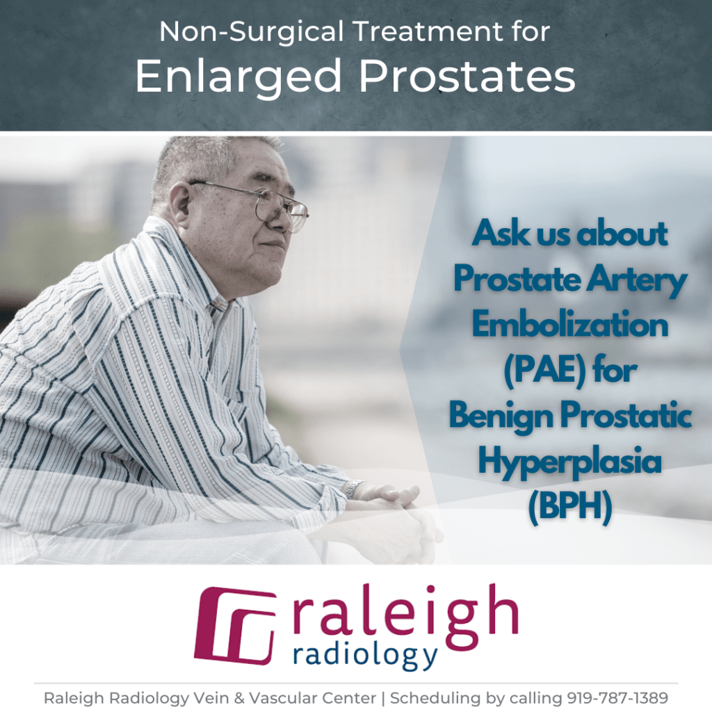Prostate artery embolization (PAE) is a minimally invasive procedure for men with enlarged prostates that can greatly reduce symptoms without the side effects of traditional more invasive prostate surgery. Benefits: a smaller incision, less pain, no overnight hospital stay, and fewer reported side effects. To schedule a consultation, call Raleigh Radiology at (919) 787-1389.