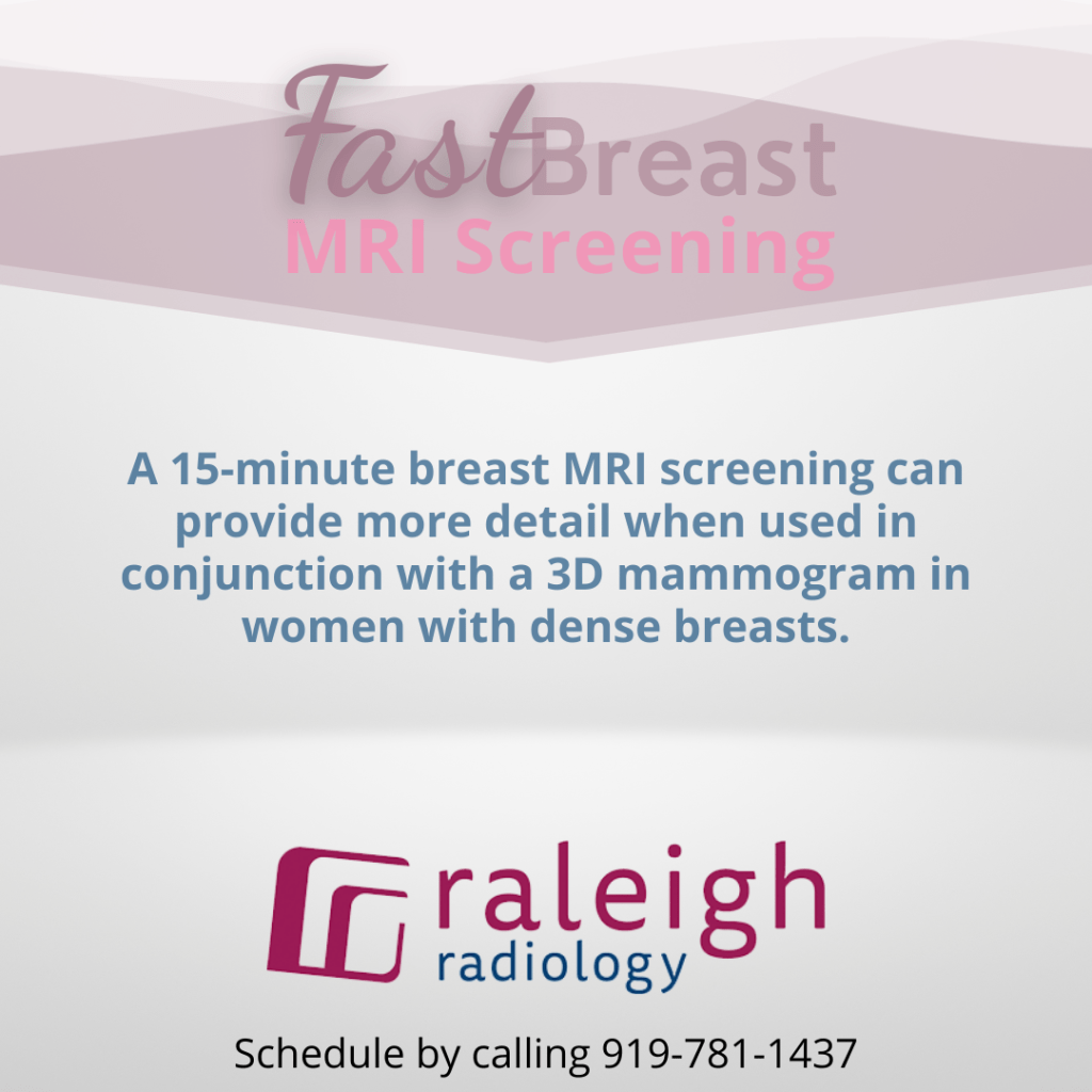 Fast Breast MRI provides added peace of mind for women of average-risk women with dense breasts. There is no radiation used with this imaging procedure. Mammography remains an effective tool in detecting cancers, but finding cancers in a denser breast can be more challenging. A 15-minute breast MRI exam called Fast Breast MRI can provide more detail when used in conjunction with a 3-D mammogram in women with dense breasts.