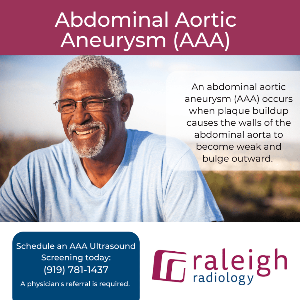 An abdominal aortic aneurysm (AAA) occurs when plaque buildup causes the walls of the abdominal aorta to become weak and bulge outward. An AAA Ultrasound is a safe, non-invasive screening that uses sound waves to detect the presence of an aneurysm. This screening is appropriate for men ages 65 to 75 who have ever smoked cigarettes and non-smokers with a family history of aneurysms. A physician’s order is required. Call us at 919-781-1437 to schedule a screening at one of our imaging centers.
